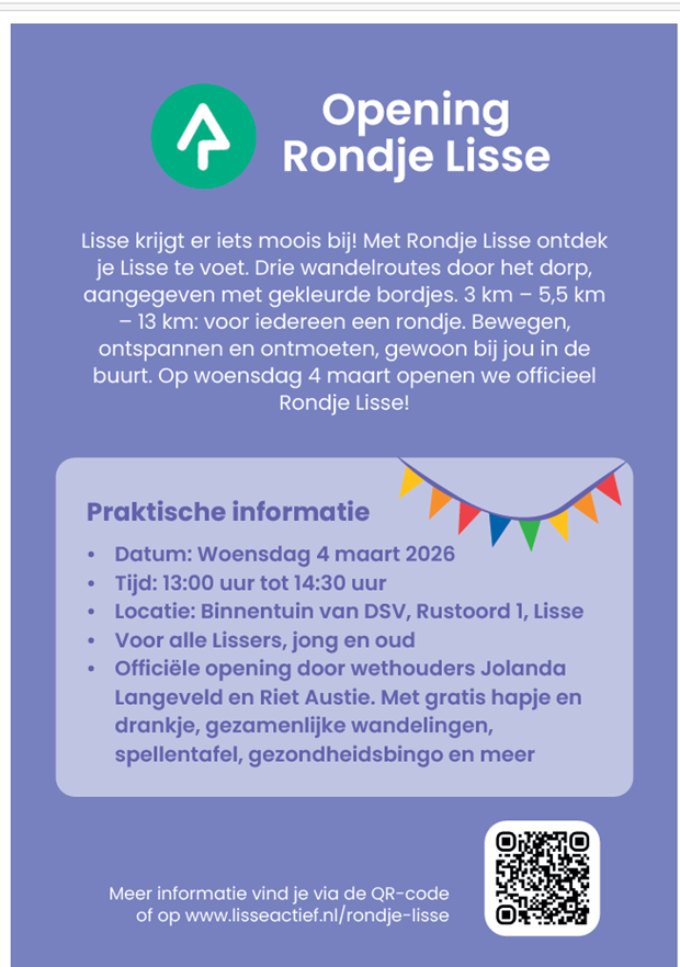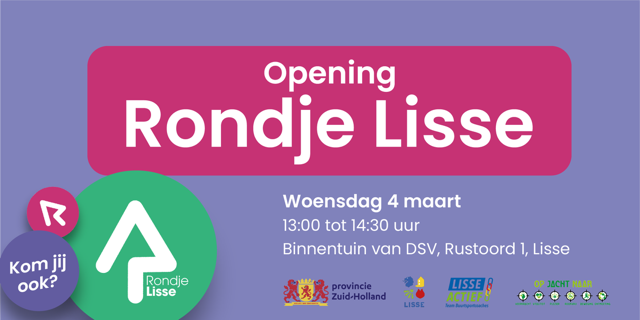 De feestelijke opening van Rondje Lisse is op 4 maart, van 13.00 tot 14.30 uur, in de binnentuin van DSV Rustoord in Lisse. De opening gebeurt door de wethouders Jolanda Langeveld en Riet Austie. Er zijn spellen en een gezondheidsbingo en natuurlijk een hapje en drankje, voor bewoners, bezoekers, collega’s, dorpsgenoten, jong en ouder.