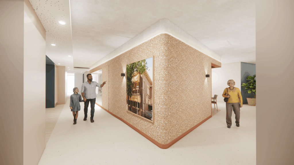Er zijn natuurlijke looppaden voor de bewoners, lichte ruimtes om in te werken, beweeg-, zit- en doe-hoekjes gemaakt. Alles gericht op de functies van het nieuwe gebouw, waarin geleefd wordt, gewoond en gewerkt. En waar natuurlijk ook activiteiten georganiseerd zullen worden voor bewoners en buurtgenoten. Nieuw Salem zal ook weer een echte buurtfunctie krijgen en zo verbinding maken met en in de wijk. De grote open ruimte van de entree is daarop ook mooi afgestemd. Hier voel je direct een warm welkom. De hospice krijgt bovenin het gebouw een prachtige plek.