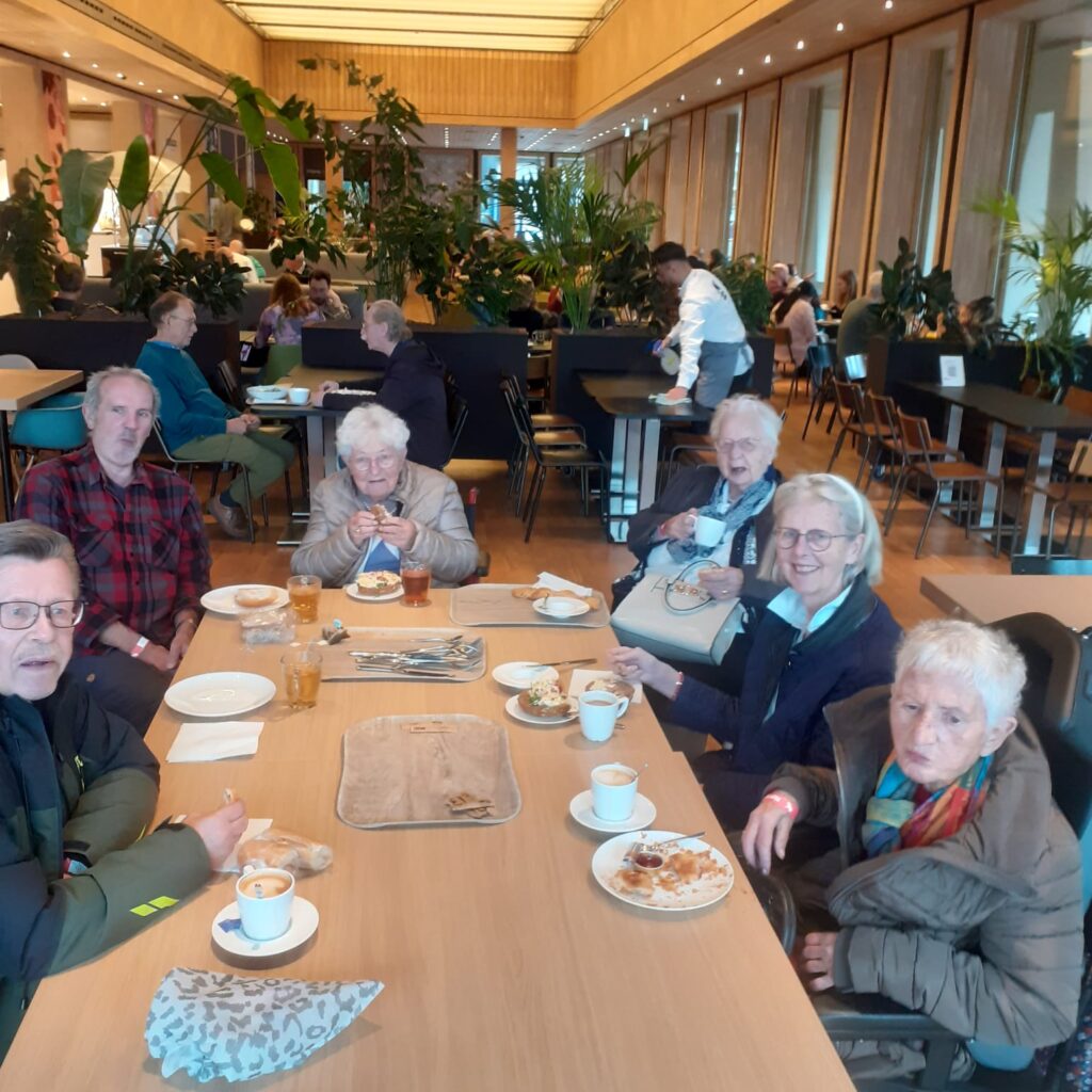 Daar aangekomen namen we eerst een lekker kopje koffie en een broodje in het restaurant. We hadden er een heel leuke ontmoeting van een van onze bewoonsters met haar zoon. Want hij werkt in dat restaurant. Mooi om te zien!